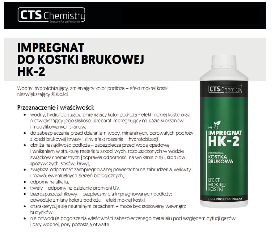 HK-2 wykonany jest na bazie siloksanów i modyfikowanych silanów w celu zabezpieczenia przed działaniem wody, mineralnych, porowatych podłoży z kostki betonowej (trwały i silny efekt roszenia – hydrofobizacji).