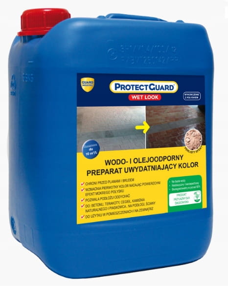 ProtectGuard WL Pół-Połysk to impregnat tworzący efekt “mokrego” pół-połysku do zabezpieczenia materiałów porowatych takich jak: Cegła na podłodze lub ścianie, terakota, kamień naturalny, beton – nadający im trwały efekt tzw. efekt mokrego kamienia lub efekt mokrej cegły.